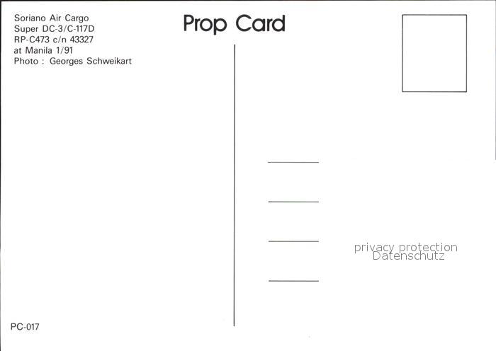 Flugzeuge Zivil Soriano Air Cargo Super DC-3/C-117D RP-C47 c/n 43327 postalisch nicht gelaufen Erhaltung siehe scans