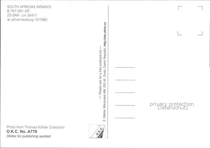 Flugzeuge Zivil South African Airways B-767-2B1 ER ZS-SRA c/n 26471 postalisch nicht gelaufen Erhaltung siehe scans