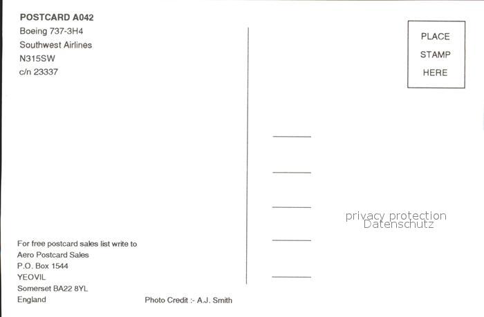 Flugzeuge Zivil Southwest Airlines Boeing 737-3H4 N315SW c/n 23337 postalisch nicht gelaufen Erhaltung siehe scans