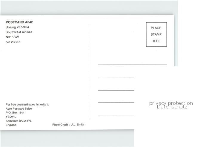 Flugzeuge Zivil Southwest Airlines Boeing 7637-3H4 N315SW c/n 23337 postalisch nicht gelaufen Erhaltung siehe scans