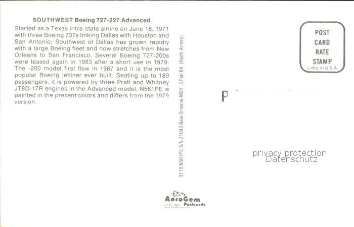 Flugzeuge Zivil Southwest Boeing 727-227 Advanced postalisch nicht gelaufen Erhaltung siehe scans