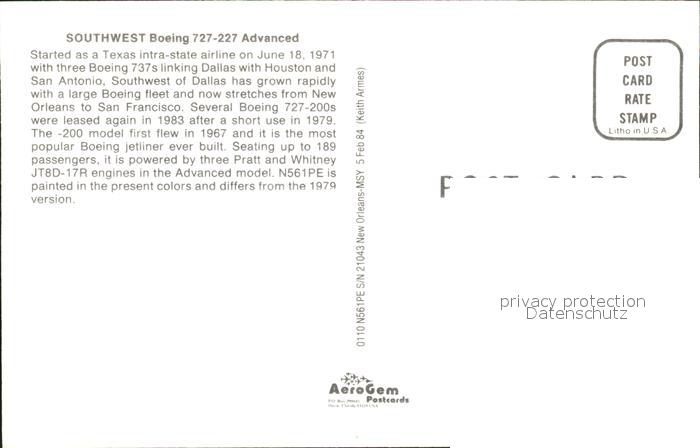 Flugzeuge Zivil Southwest Boeing 727-227 Advanced N561PE postalisch nicht gelaufen