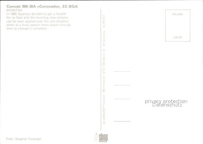 Flugzeuge Zivil Spantax Convair 990-30A Coronation EC-BQA postalisch nicht gelaufen Erhaltung siehe scans