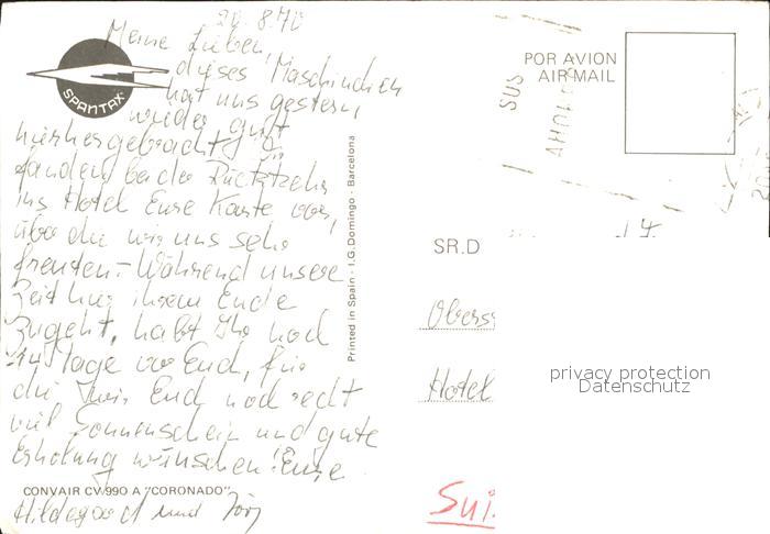 alte Postkarte Flugzeuge Zivil Spantax Convair CV 990 A Coronado postalisch gelaufen Erhaltung siehe scans