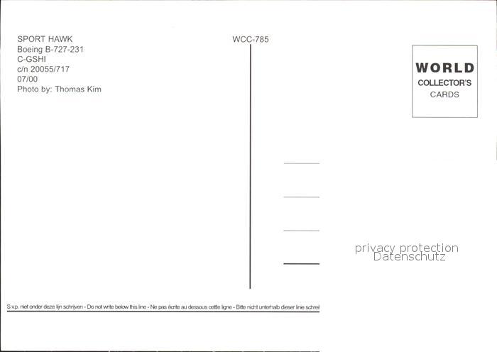 Flugzeuge Zivil Sport Hawk Boeing B-727-231 C-GSHI c/n 20055/717 postalisch nicht gelaufen Erhaltung siehe scans