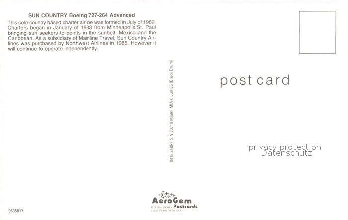 Flugzeuge Zivil Sun Country Boeing 727-264 Advanced EI-BRF S/N 20710 postalisch nicht gelaufen Erhaltung siehe scans