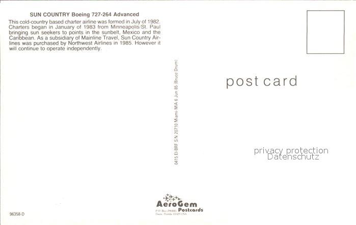 Flugzeuge Zivil Sun Country Boeing 727-264 Advanced postalisch nicht gelaufen Erhaltung siehe scans