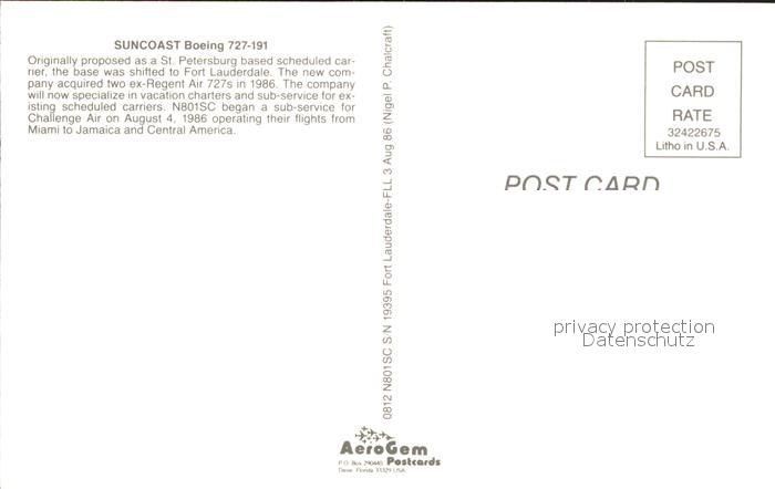 Flugzeuge Zivil SunCoast Boeing 727-191 N801SC s/n 19395 postalisch nicht gelaufen Erhaltung siehe scans