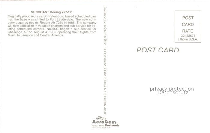 Flugzeuge Zivil Suncoast Boeing 727-191 N801SC S/N 19395 postalisch nicht gelaufen Erhaltung siehe scans