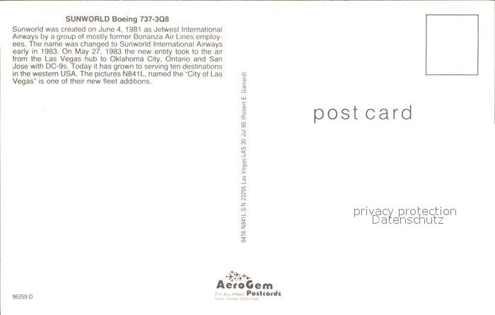 Flugzeuge Zivil Sunworld Boeing 737-3Q8 N841L S/N 23255 postalisch nicht gelaufen Erhaltung siehe scans