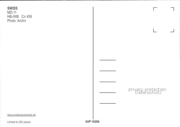 Flugzeuge Zivil Swiss MD-11 HB-IWB Cn 459 postalisch nicht gelaufen Erhaltung siehe scans