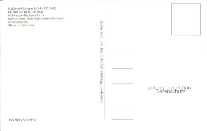 Flugzeuge Zivil Swissair Bachenbuelach McDonnell Douglas MD-81 DC-9-81 HB-IND cn 48003 fn 944 postalisch nicht gelaufen Erhaltung siehe scans