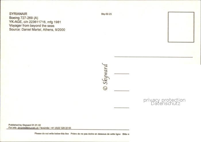Flugzeuge Zivil SYRIANAIR Boeing 727-269 (A) YK-AGE postalisch nicht gelaufen Erhaltung siehe scans