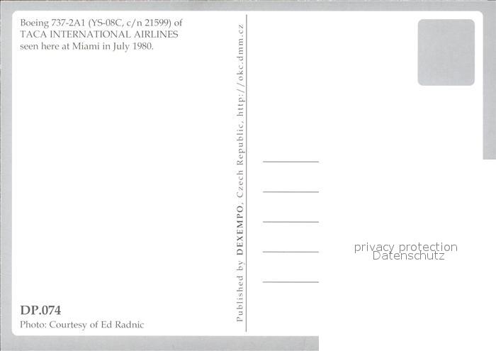 Flugzeuge Zivil Taca International Airlines Boeing 737-2A1 YS-08C c/n 21599 postalisch nicht gelaufen Erhaltung siehe scans