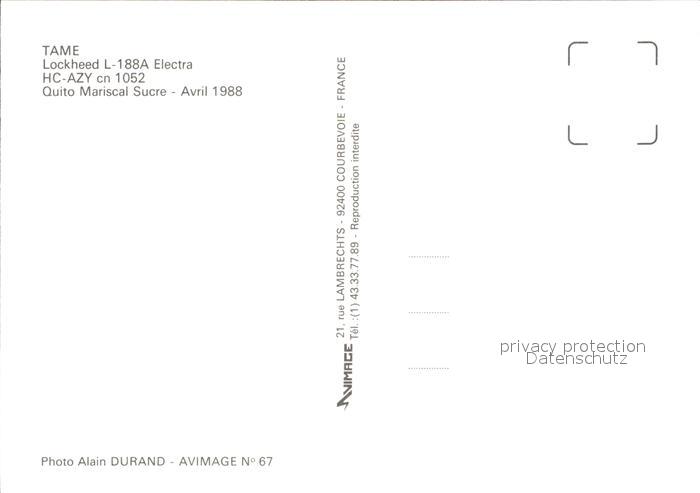 Flugzeuge Zivil TAME Lockheed L-188A Electra HC-AZY cn 1052 postalisch nicht gelaufen Erhaltung siehe scans