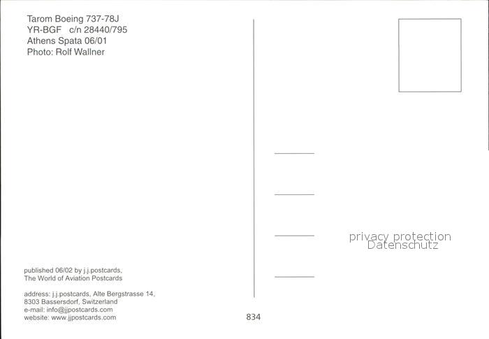 Flugzeuge Zivil Tarom Boeing 737-78J YR-BGF c/n 28440/795 postalisch nicht gelaufen Erhaltung siehe scans