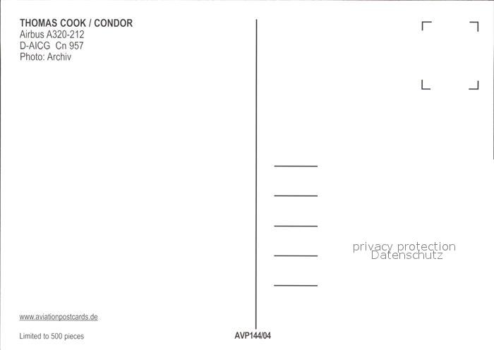 Flugzeuge Zivil Thomas Cook Condor A320-212 D-AICG cn 957 postalisch nicht gelaufen Erhaltung siehe scans