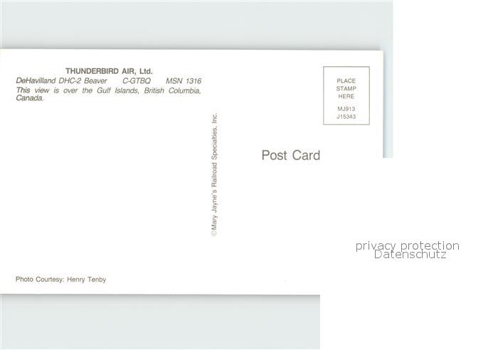 Flugzeuge Zivil Thunderbird Air DeHavilland DHC-2 Beaver C-GTBQ MSN 1316 postalisch nicht gelaufen Erhaltung siehe scans