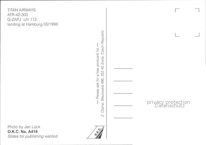 Flugzeuge Zivil Titan Airways ATR-42-300 G-ZAPJ c/n 113 postalisch nicht gelaufen Erhaltung siehe scans
