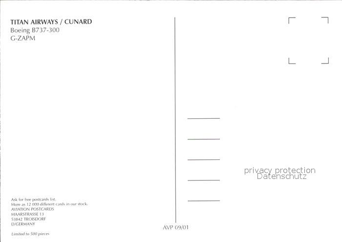 Flugzeuge Zivil Titan Airways Cunard Boeing 737-300 G-ZAPM postalisch nicht gelaufen Erhaltung siehe scans