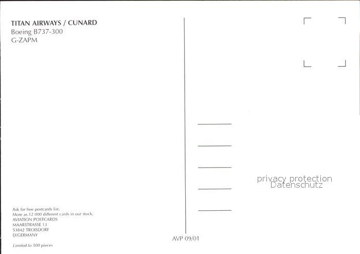 Flugzeuge Zivil Titan Airways Cunard Boeing B737-300 G-ZAPM postalisch nicht gelaufen Erhaltung siehe scans