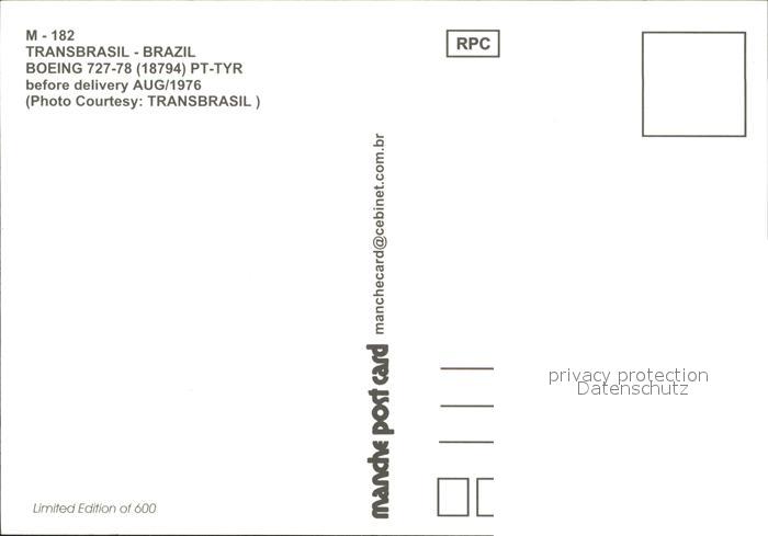 Flugzeuge Zivil Trans Brasil Boeing 727-78 18794 PT-TYR postalisch nicht gelaufen Erhaltung siehe scans