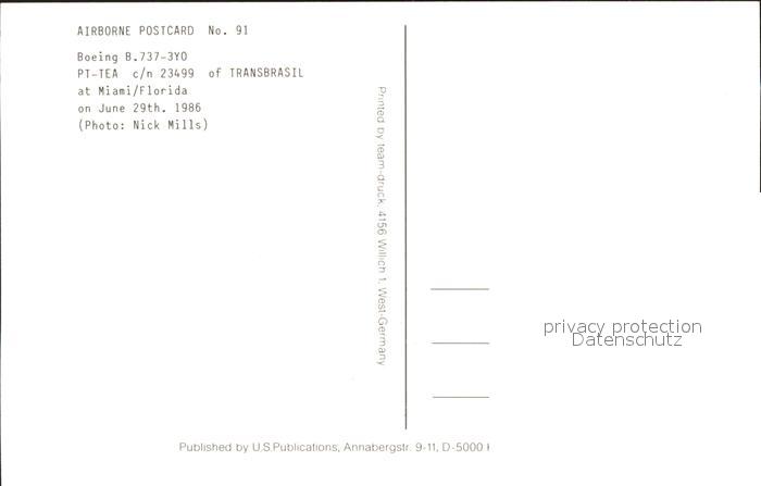 Flugzeuge Zivil Trans Brasil Boeing B737-3Y0 PT-TEA c/n 23499 postalisch nicht gelaufen Erhaltung siehe scans