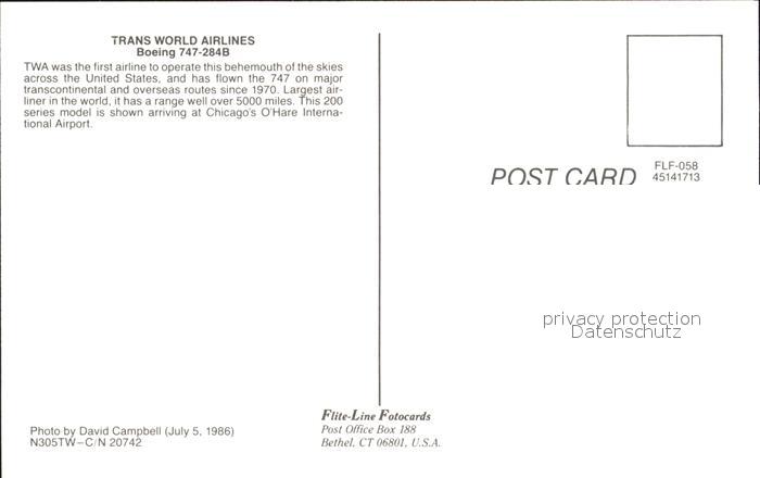 Flugzeuge Zivil Trans World Airlines Boeing 747-284B postalisch nicht gelaufen Erhaltung siehe scans
