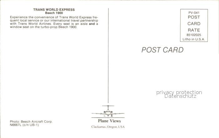 Flugzeuge Zivil Trans World Express Beech 1900 postalisch nicht gelaufen Erhaltung siehe scans