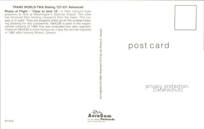 Flugzeuge Zivil Trans Worls TWA Boeing 727-231 Advanced N64339 postalisch nicht gelaufen