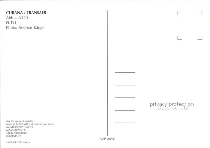 Flugzeuge Zivil TransAer Cubana A320 EI-TLJ postalisch nicht gelaufen Erhaltung siehe scans