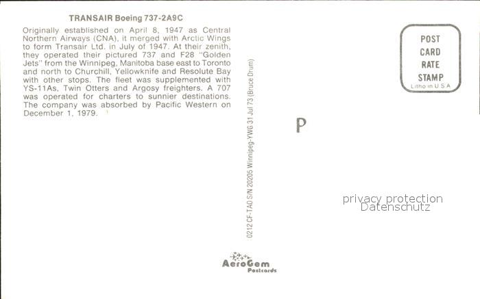 Flugzeuge Zivil Transair Boeing 737-2A9C CF-TAO postalisch nicht gelaufen Erhaltung siehe scans