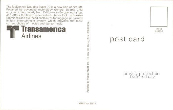 Flugzeuge Zivil Transamerica Airlines McDonnell Douglas Super 73 N4865T c/n 46073 postalisch nicht gelaufen Erhaltung siehe scans