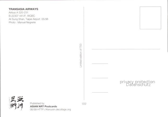 Flugzeuge Zivil Transasia Airways Airbus A 320-231 B-22307 441/F WQBC postalisch nicht gelaufen Erhaltung siehe scans