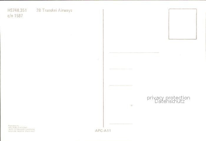 Flugzeuge Zivil Transkei Airways HS748.351 ZS-XGE c/n 1587 postalisch nicht gelaufen Erhaltung siehe scans