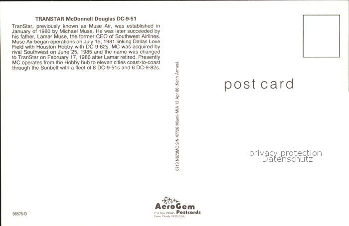 Flugzeuge Zivil TranStar McDonnell Douglas DC-9-51 N673MC postalisch nicht gelaufen Erhaltung siehe scans