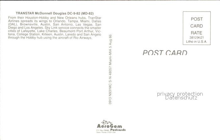 Flugzeuge Zivil TranStar McDonnell Douglas DC-9-82 postalisch nicht gelaufen Erhaltung siehe scans