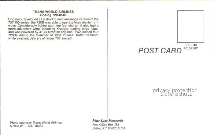 Flugzeuge Zivil TransWorld Airlines Boeing 720-051B N793TW c/n 18383 postalisch nicht gelaufen Erhaltung siehe scans