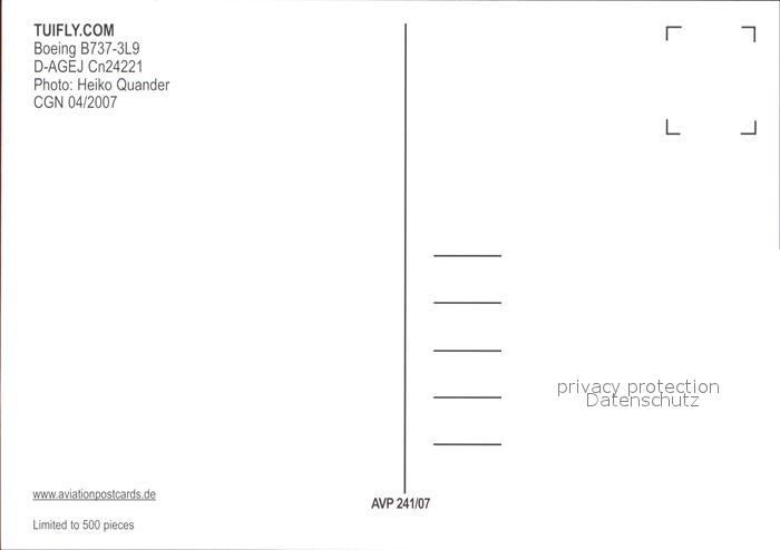 Flugzeuge Zivil Tuifly.com Boeing 737-3L9 D-AGEJ Cn24221 postalisch nicht gelaufen Erhaltung siehe scans