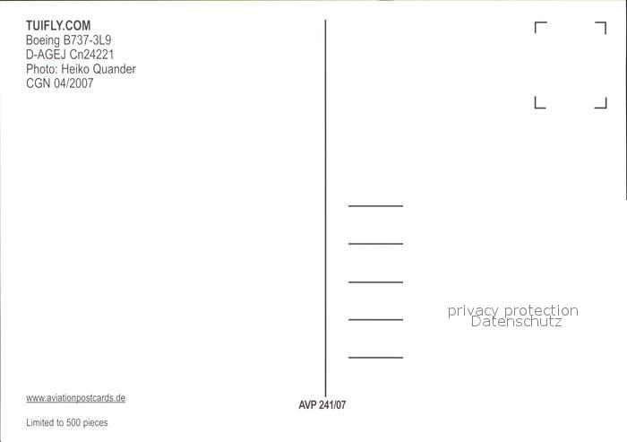 Flugzeuge Zivil Tuifly.com Boeing B737-3L9 D-AGEJ Cn 24221 postalisch nicht gelaufen Erhaltung siehe scans