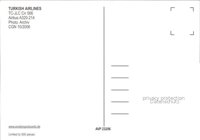 Flugzeuge Zivil Turkish Airlines A320-214 A320-214 TC-JLC Cn566 postalisch nicht gelaufen Erhaltung siehe scans