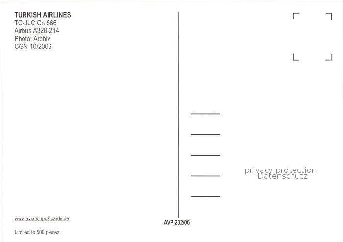 Flugzeuge Zivil Turkish Airlines A320-214 TC-JLC cn 566 postalisch nicht gelaufen Erhaltung siehe scans