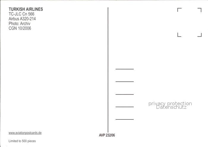 Flugzeuge Zivil Turkish Airlines TC-JLC Cn 566 Airbus 320-214 postalisch nicht gelaufen Erhaltung siehe scans