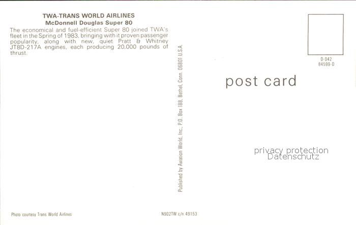 Flugzeuge Zivil TWA Trans World Airlines McDonnell Douglas Super 80 N902TW postalisch nicht gelaufen Erhaltung siehe scans