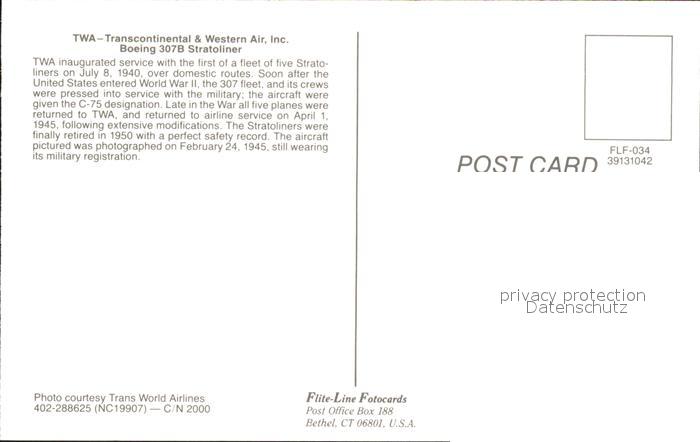 Flugzeuge Zivil TWA Transcontinental & Western Air Boeing 307B Stratoliner NC19907 c/n 2000 postalisch nicht gelaufen Erhaltung siehe scans
