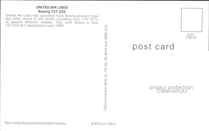 Flugzeuge Zivil United Air Lines Boeing 727-222 N7641U c/n 19914 postalisch nicht gelaufen Erhaltung siehe scans