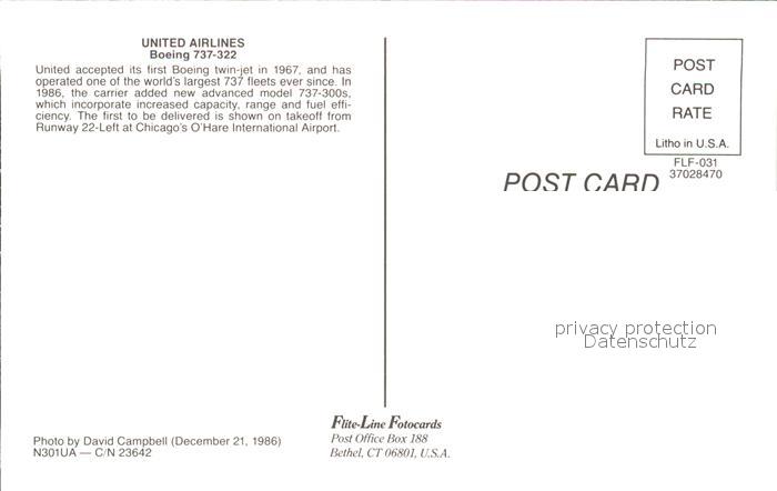Flugzeuge Zivil United Airlines Boeing 737-322 N301UA c/n 23642 postalisch nicht gelaufen Erhaltung siehe scans
