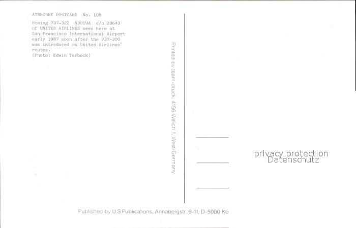 Flugzeuge Zivil United Airlines Boeing 737-322 N301UA c/n 23643 postalisch nicht gelaufen Erhaltung siehe scans