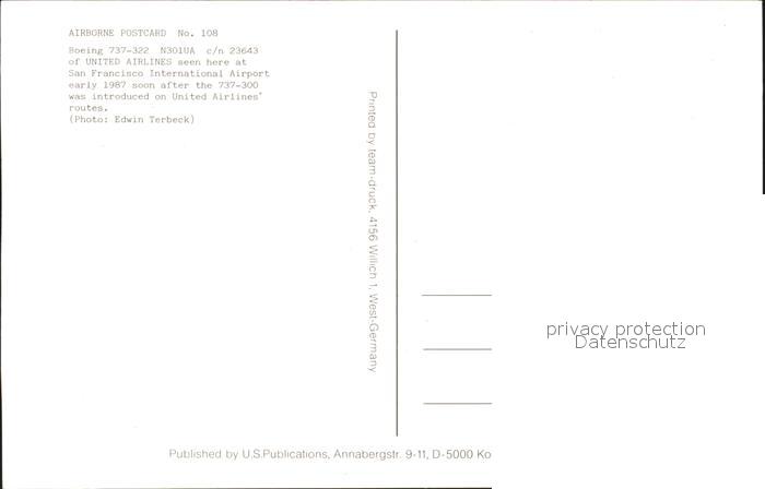 Flugzeuge Zivil United Airlines Boeing 737-322 N301UA c/n 23643 postalisch nicht gelaufen Erhaltung siehe scans