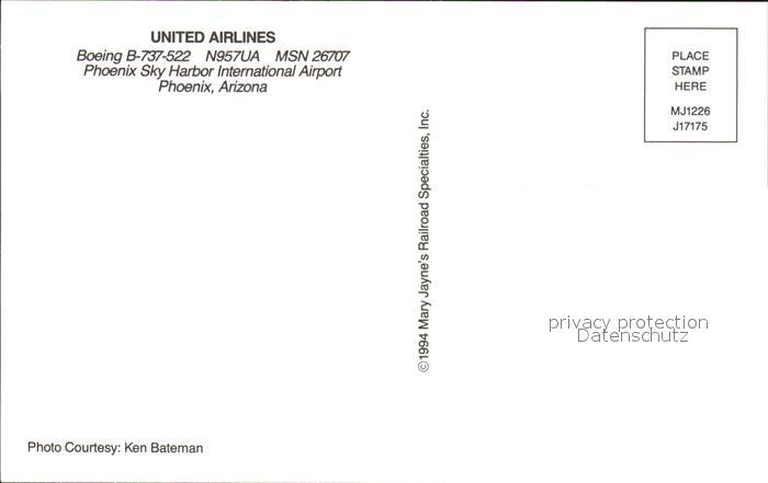 Flugzeuge Zivil United Airlines Boeing B-737-522 N957UA postalisch nicht gelaufen Erhaltung siehe scans